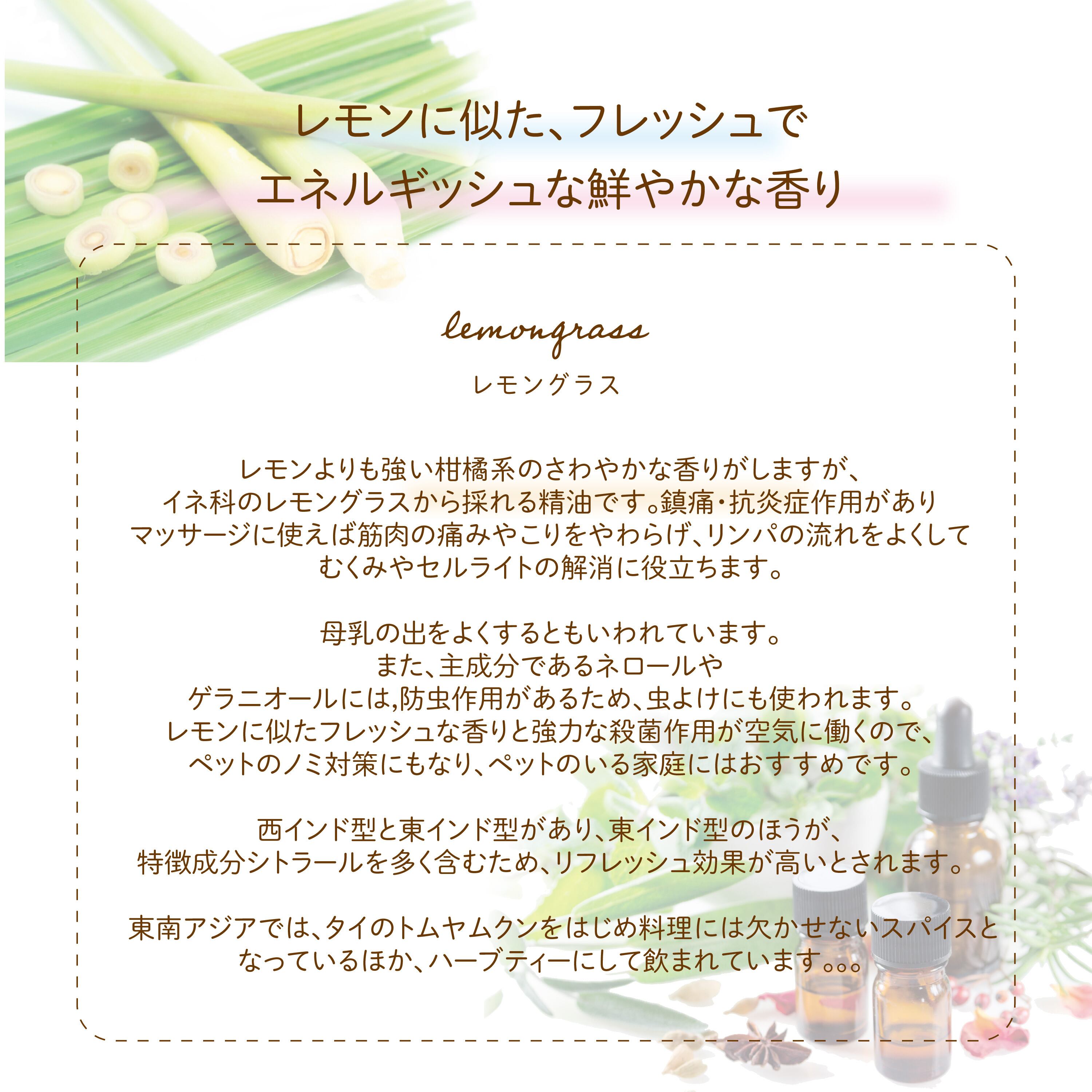 レモンよりも強い柑橘系のさわやかな香りがしますが、イネ科のレモングラスから採れる精油です。鎮痛・抗炎症作用があり、マッサージに使えば筋肉の痛みやこりをやわらげ、リンパの流れをよくしてむくみやセルライトの解消に役立ちます。母乳の出をよくするともいわれています。また、主成分であるネロールやゲラニオールには防虫作用があるため、虫よけにも使われます。レモンに似たフレッシュな香りと強力な殺菌作用が空気に働くので、ペットのノミ対策にもなり、ペットのいる家庭にはおすすめです。