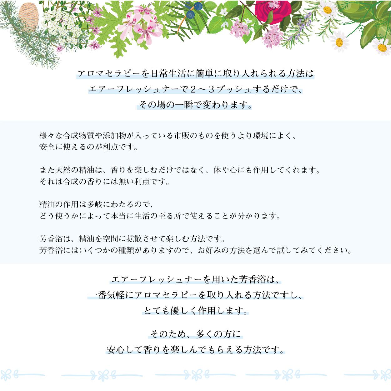 相手の気持ちをも動かす力があります。気分がすぐれない時もよい香りに包まれると何故か気分がほころびます。例えば、好意にしてる人の匂いは、もっともっと嗅ぎたくなりませんか? その人があらわれただけで、その場の空気が一瞬にして変わる。それが凛と張り詰めたものになるか、穏やかで寛いだものになるか、明るくあたたかなものになるか、などはその人の個性によってちがってくると思いますが、自然の芳香成分を凝縮した精油は人を惹きつける大きなパワーを持っています。 また、大地の恵みを凝縮したエッセンシャルオイルの香りの最もすぐれている点は、その場にいる人達の心と体にホリスティック(全身的)に作用します。アロマエアーフレッシュナーはワンプッシュでアロマ芳香浴を体験できます。