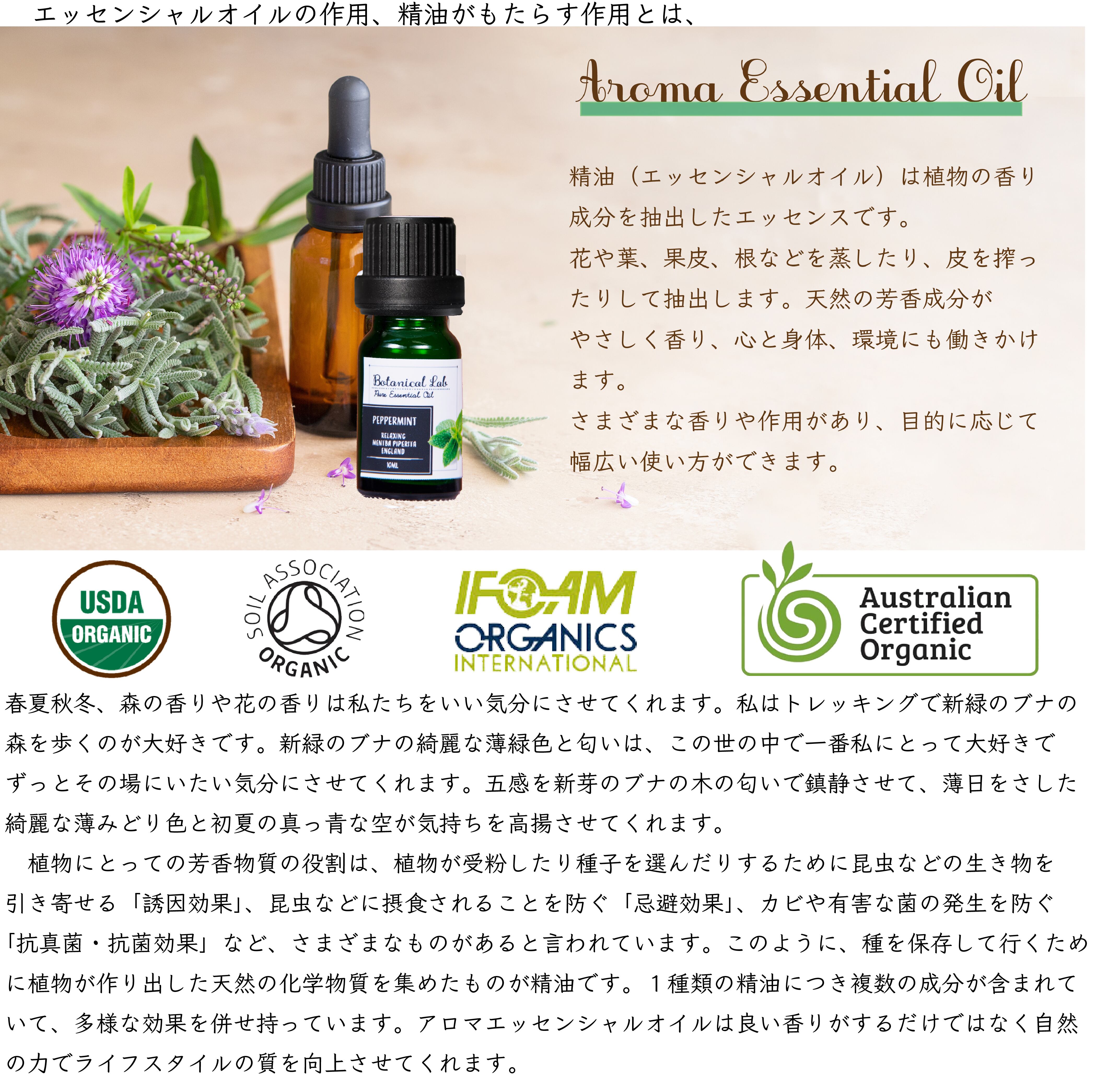 春夏秋冬、森の香りや花の香りは私たちをいい気分にさせてくれます。私はトレッキングで新緑のブナの森を歩くのが大好きです。新緑のブナの綺麗な薄緑色と匂いはこの世の中で一番私にとって大好きでずっとその場にいたい気分にさせてくれます。五感を新芽のブナの木の匂いで鎮静させて、薄日をさした綺麗な薄みどり色と初夏の真っ青な空が気持ちを高揚させてくれます。植物にとっての芳香物質の役割は、植物が受粉したり種子を選んだりするために昆虫などの生き物を引き寄せる「誘因効果」、昆虫などに摂食されることを防ぐ「忌避効果」、カビや有害な菌の発生を防ぐ「抗真菌・抗菌効果」など、さまざまなものがあると言われています。このように、種を保存して行くために植物が作り出した天然の化学物質を集めたものが精油です。1種類の精油につき複数の成分が含まれていて、多様な効果を併せ持っています。アロマエッセンシャルオイルは良い香りがするだけではなく自然の力でライフスタイルの質を向上させてくれます。