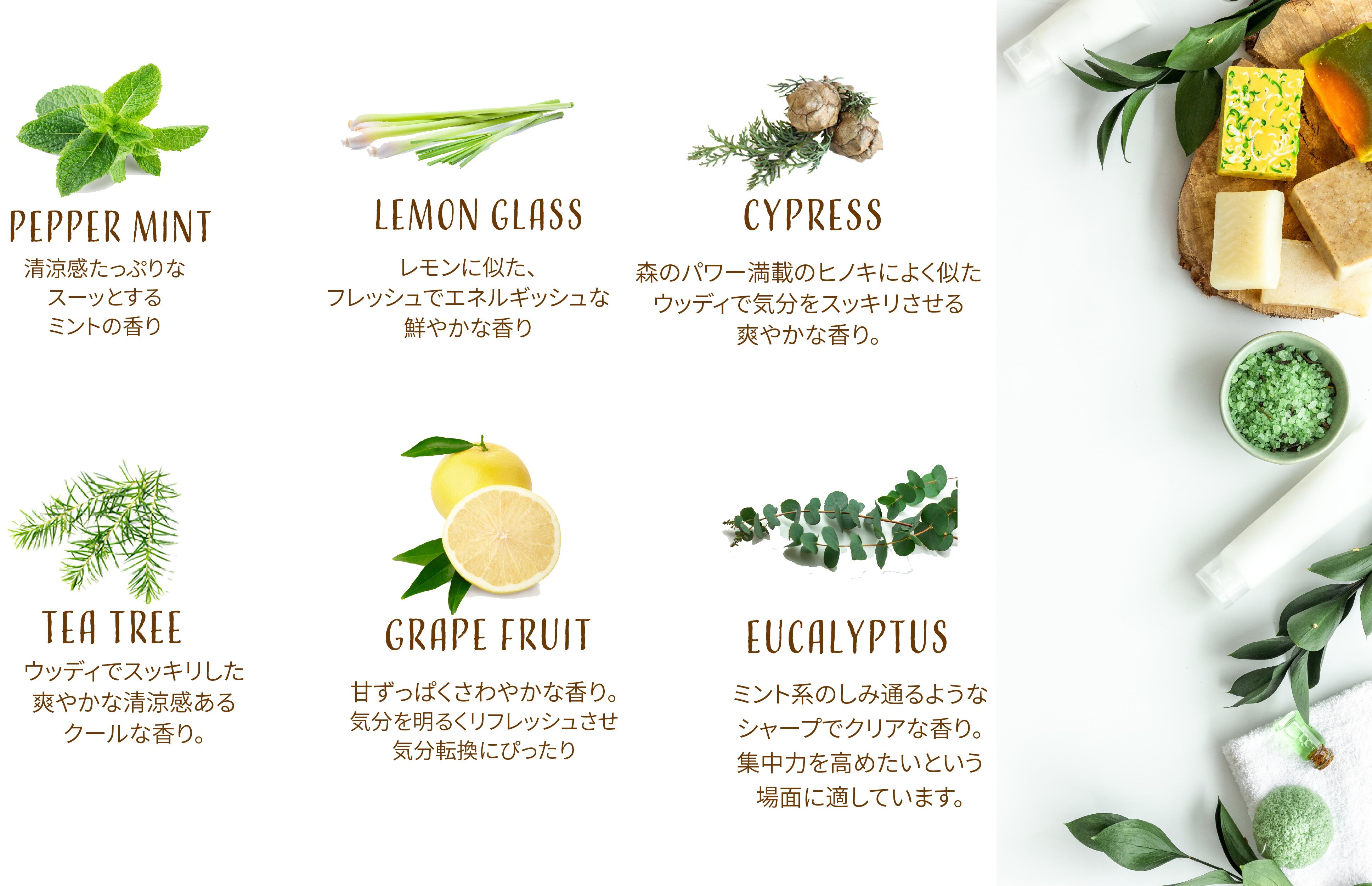 リフレッシュさせたりするものです。香りの効力で心と体のバランスを整えて心身ともに癒します。