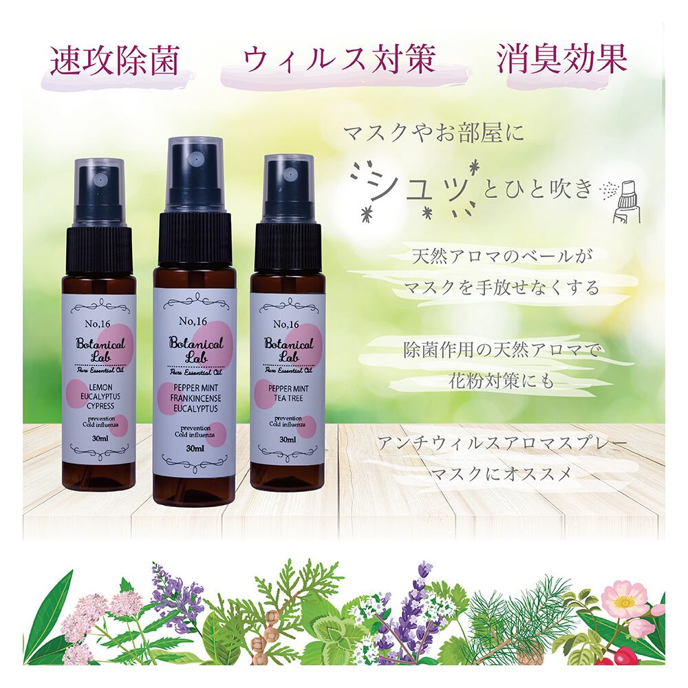 Botanical lab アロマスプレー エアーフレッシュナー 除菌・消臭・マスク消臭に 30ml 3本セット ペパーミント、ユーカリー、フランキンセンス 天然アロマオイル配合