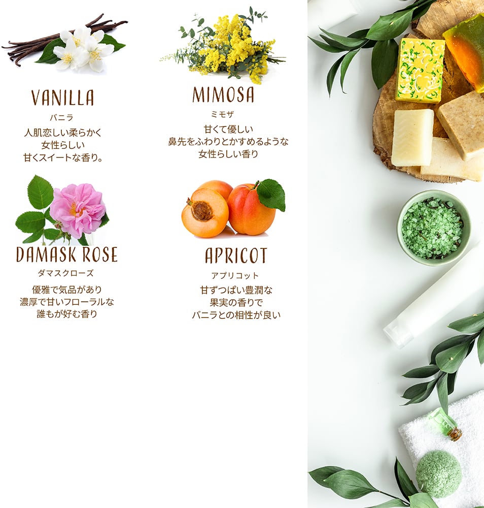 ふんわり香りたち、ボディを包み込む気分で選べる8パターンをご用意