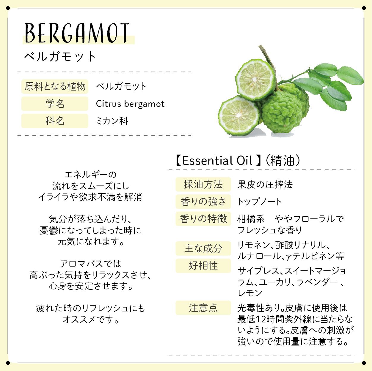 • ベルガモット 学名:Citrus aurantium bergamia 科名:フトモモ科 原産国:フランス 抽出部位:果皮 抽出方法:圧搾法