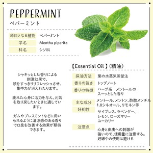 • ペパーミント 学名:Mentha piperita 科名:ミカン科 原産国:アメリカ 抽出部位:全草 抽出方法:水蒸気蒸留法
